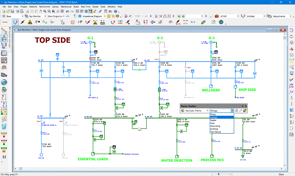 Set different themes for individual one-line diagrams. Themes can be color coded based on standard, voltage level, area, system grounding, earthing, deenergized elements, feeder, etc.