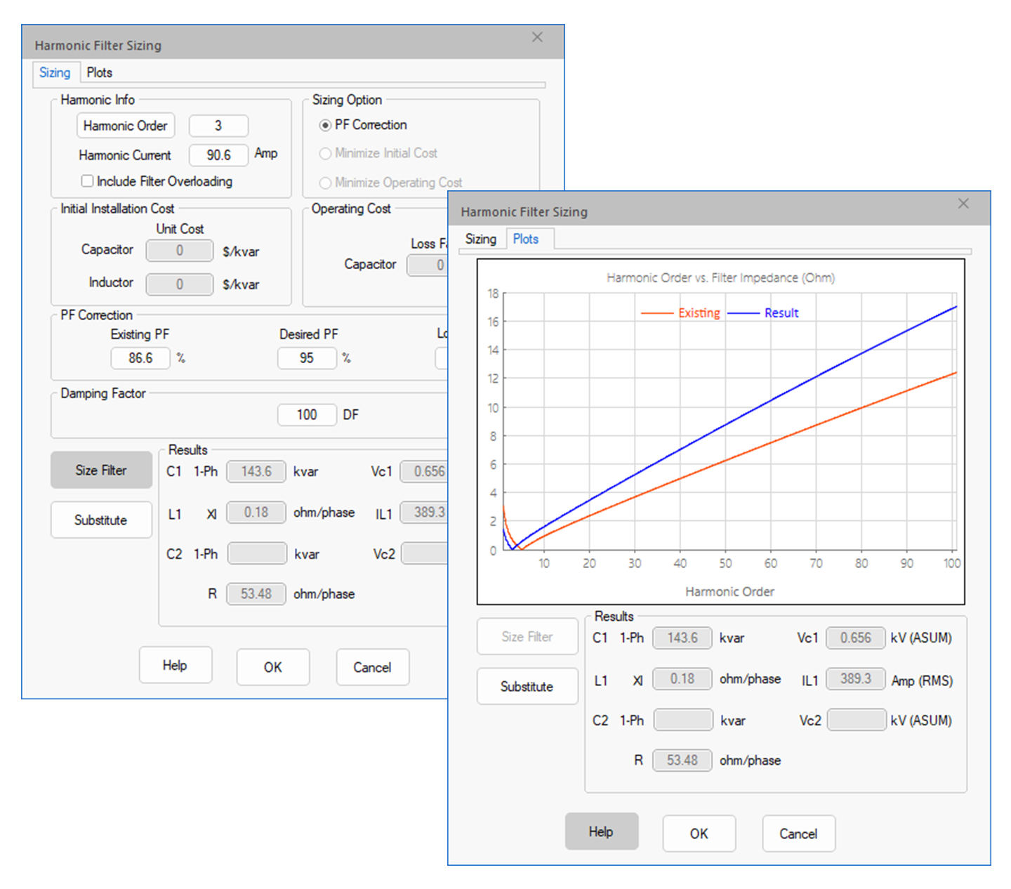 A properly designed harmonic filter can prevent the harmonic current from injecting into the system, or it can provide a low impedance path at the tuned frequency to remove a parallel resonance. The Harmonic Filter editor provides all the practical and popular filter structures for you to choose from.