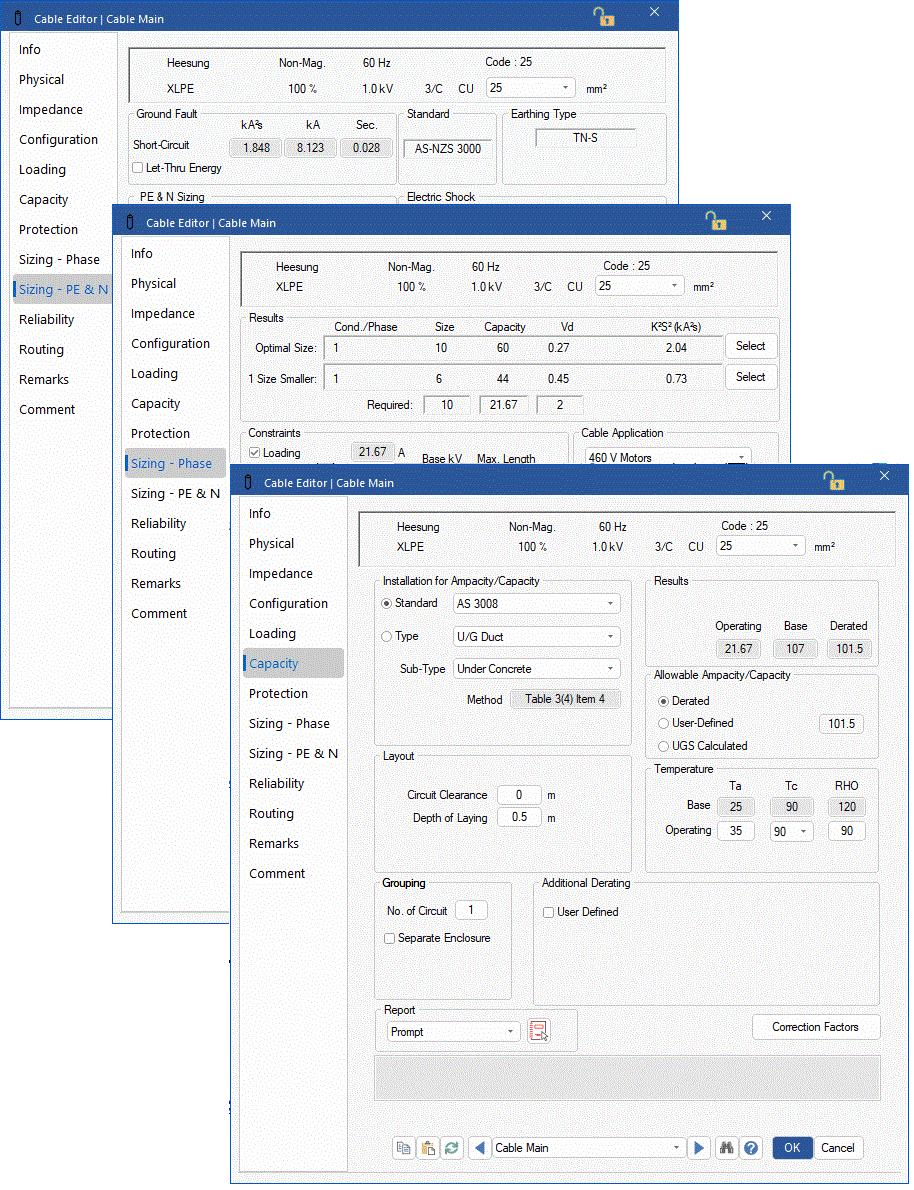 ETAP’s cable current capacity calculation handles both above ground (A/G) and underground (U/G in duct and buried) installations: