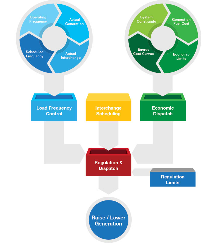 Automatic Generation Control (AGC) software calculates the required parameters or changes to optimize the operation of generation units. The automatic generation control software uses real-time data such as frequency, actual generation, tie-line load flows, and plant units’ controller status to provide generation changes.