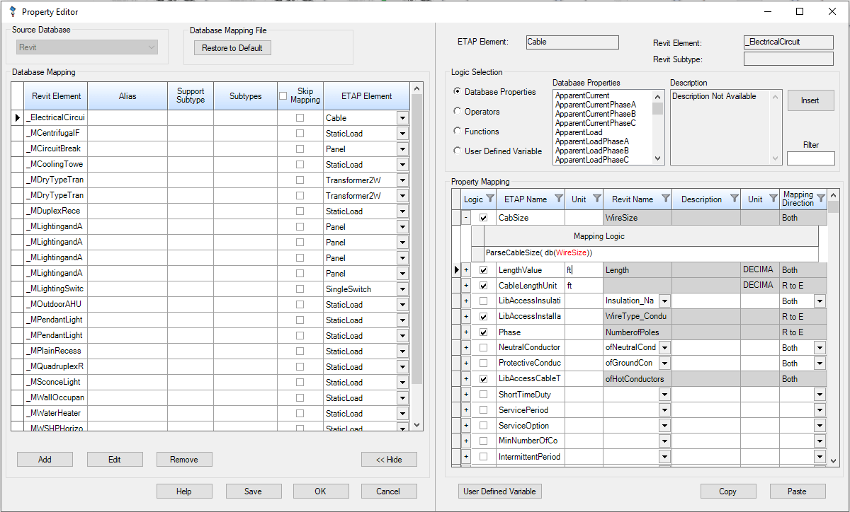 A universal mapping tool is used to define direct relations between ETAP element properties and Revit equipment attributes.