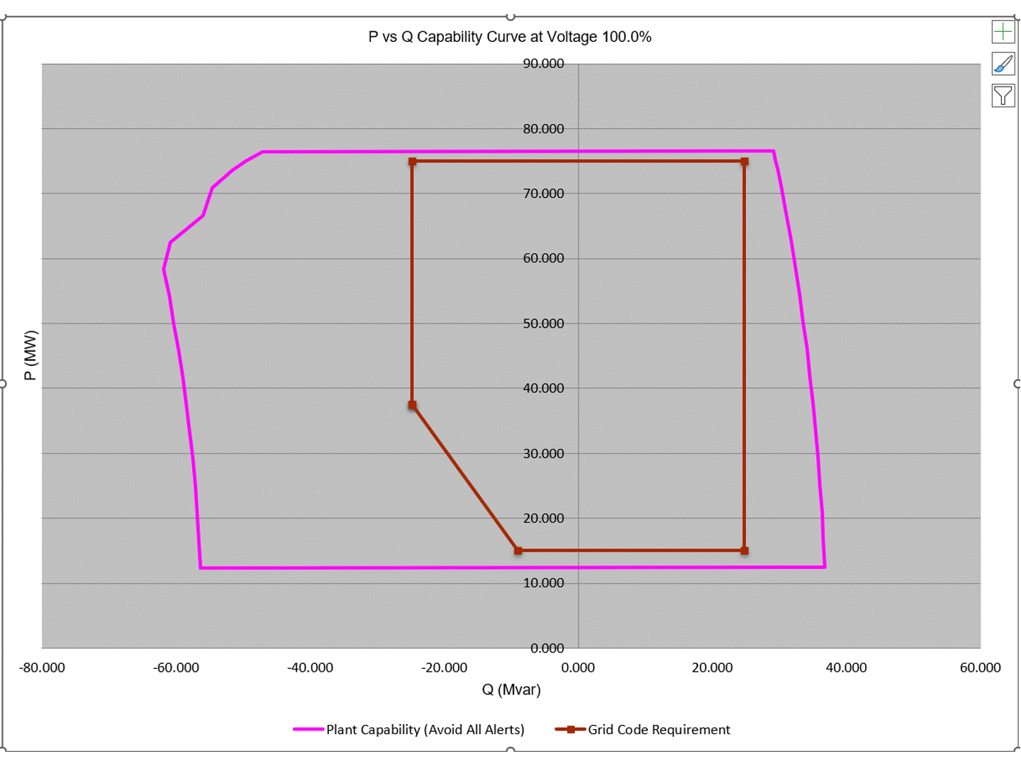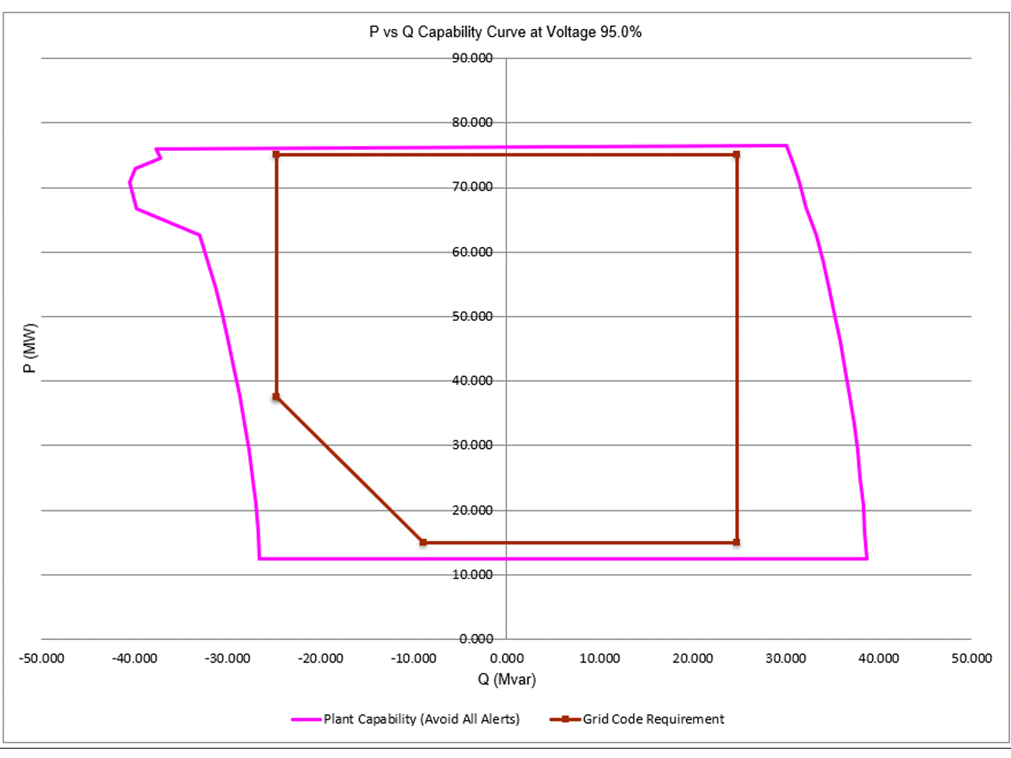 Grid Code Load Flow is used to determine a renewable power plant's reactive power capability at the Point of Measurement (POM) under normal operating conditions. In just one Grid Code Load Flow calculation, hundreds of Load Flow scenarios are run at different voltage setpoints by incrementally adjusting the MW and MVAR output from each renewable source (a process also known as 'sweeping'). All results are then compiled to obtain the total output at the POM. Upon completion, Grid Code Load Flow generates a comprehensive report including compliance details, alerts, and all of the power plant assets input data. The report includes a visualization of the power plant P-Q and V-PF capability against grid interconnection requirements including an intuitive representation of any discrepancies and compliance validation.