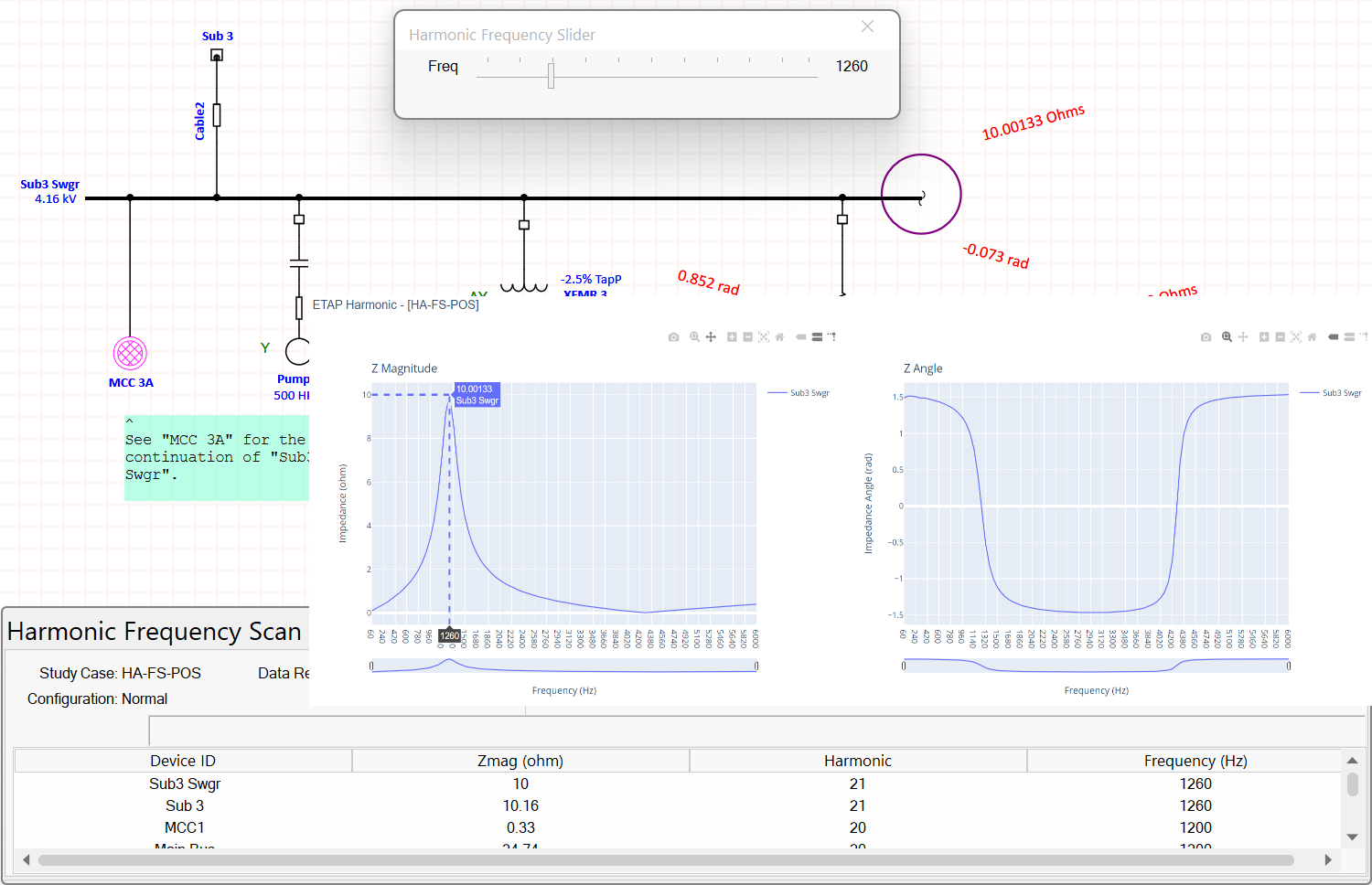 The ETAP Harmonic Frequency Scan module calculates and plots the magnitudes and phase angles of bus driving point impedance over a frequency range specified by the user.
