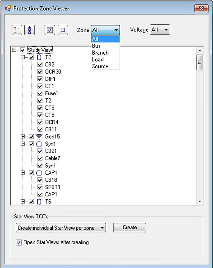 ETAP Star includes intelligent and automatic protection zone and path detection tools that quickly identifies the elements within each zone. The association of these tools with one-line diagram provides fast and easy approach to create Star View TCC (Time-Current Characteristics) and verify overcurrent protection / coordination within any selected portion of electrial network.